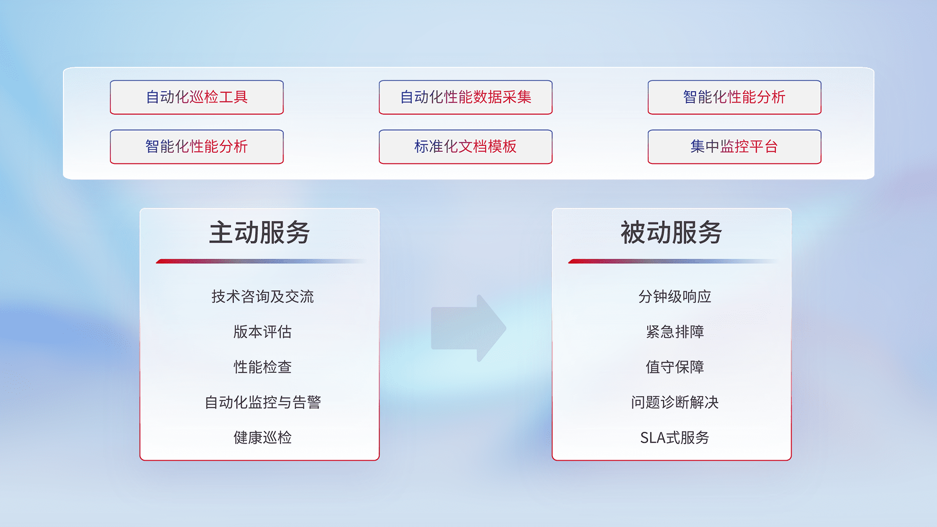 智能化工具和标准化文档,,,,保障服务质量,,,提供主动服务(包含技术咨询、、版本评估、、性能检查、、、自动化监控与告警、、、、健康巡检)和被动服务包含(分钟级响应、、紧急排障、、、值守保障、、问题诊断解决、、、SLA服务)。。。。