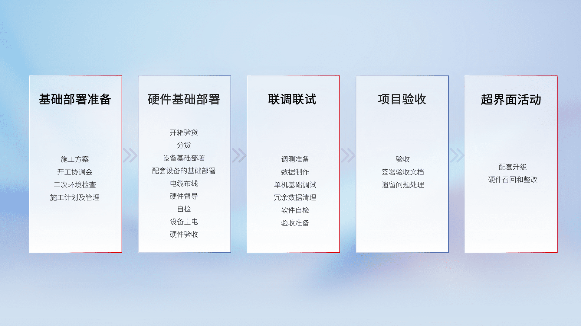 从基础部署准备、、、、硬件基础部署、、、、联调联试、、项目验收、、、越界面活动的全过程可追溯,,,保证施工质量和进度。。