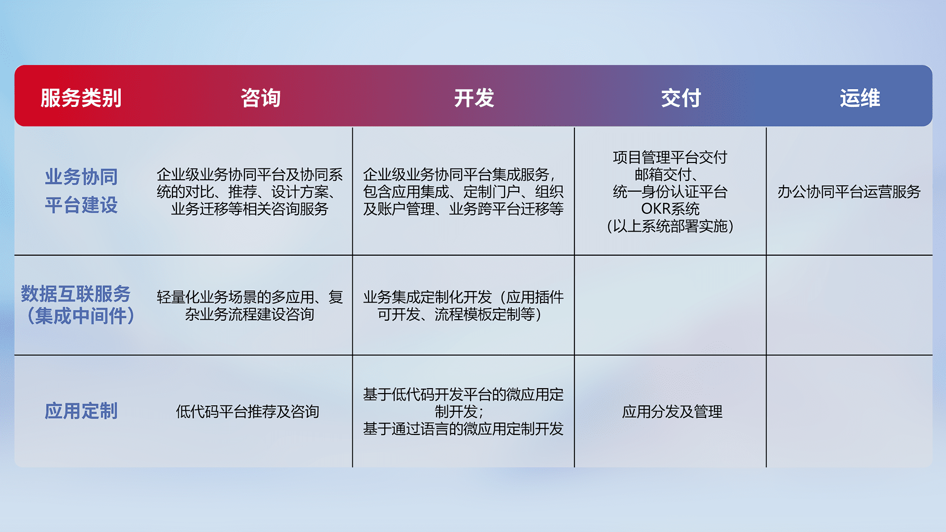 针对钉钉、、、、企微、、、IDaas等平台级产品提供产品的规划、、、方案、、、、交付、、、定制化开发等服务,,实现如统一协同办公、、、智能客户服务、、、、混合会议管理、、、、智能数据查询、、、等业务场景,,,,实现数字化转型。。。。